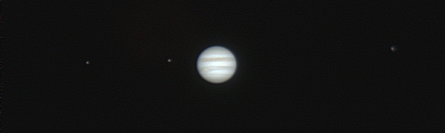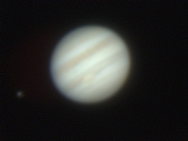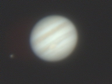 | Image brute, lentille de Barlow. Tache rouge (une seule à l'époque). | La même retouchée (luminosité contraste). On remarque un voile rouge entre Jupiter et son satelite qui est du bruit thermique du capteur. Il était temps de reprendre les "Darks"... |
